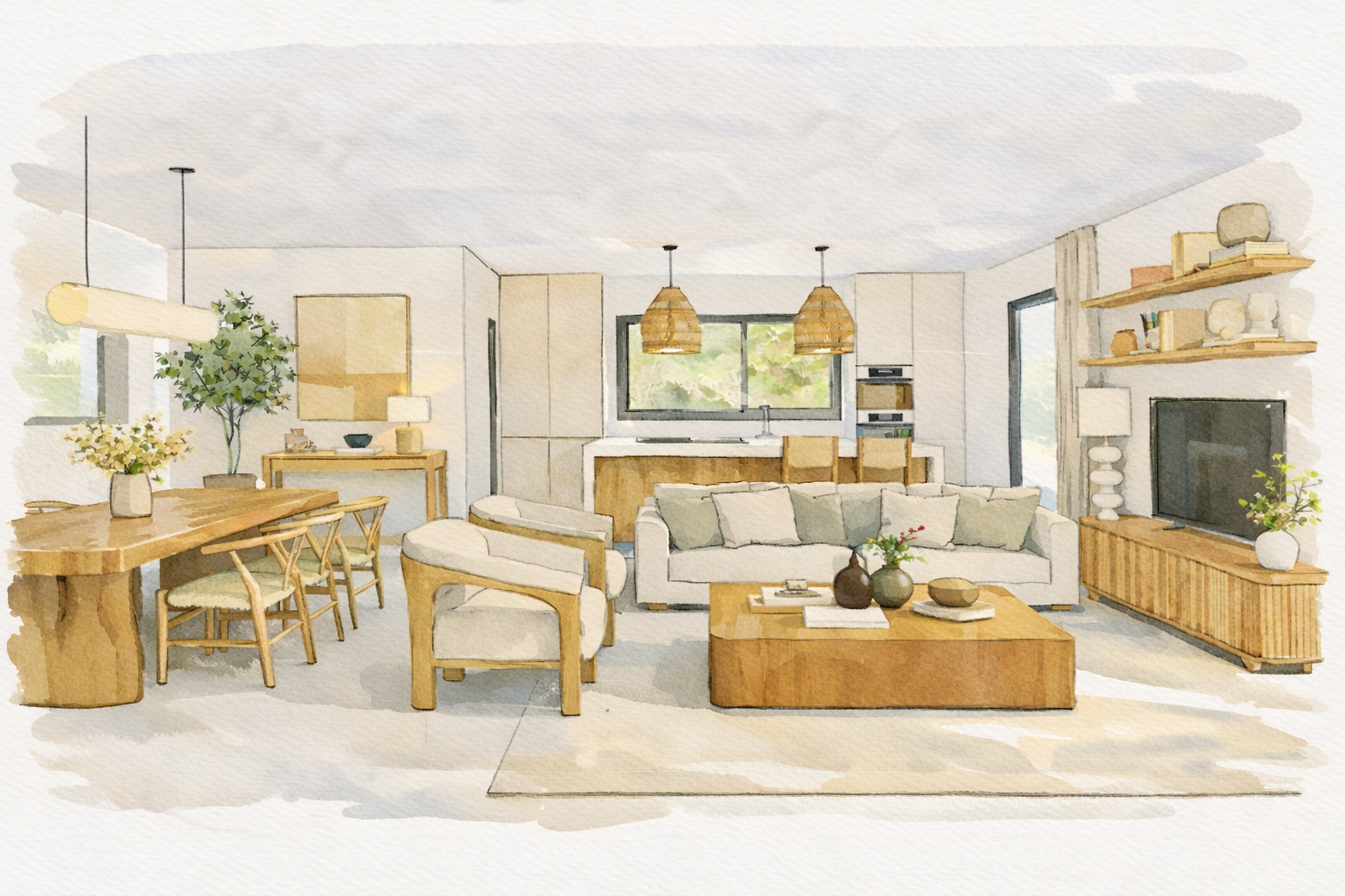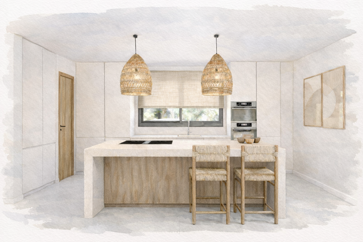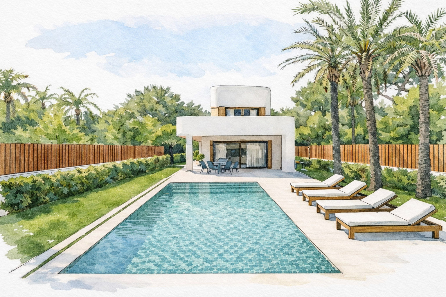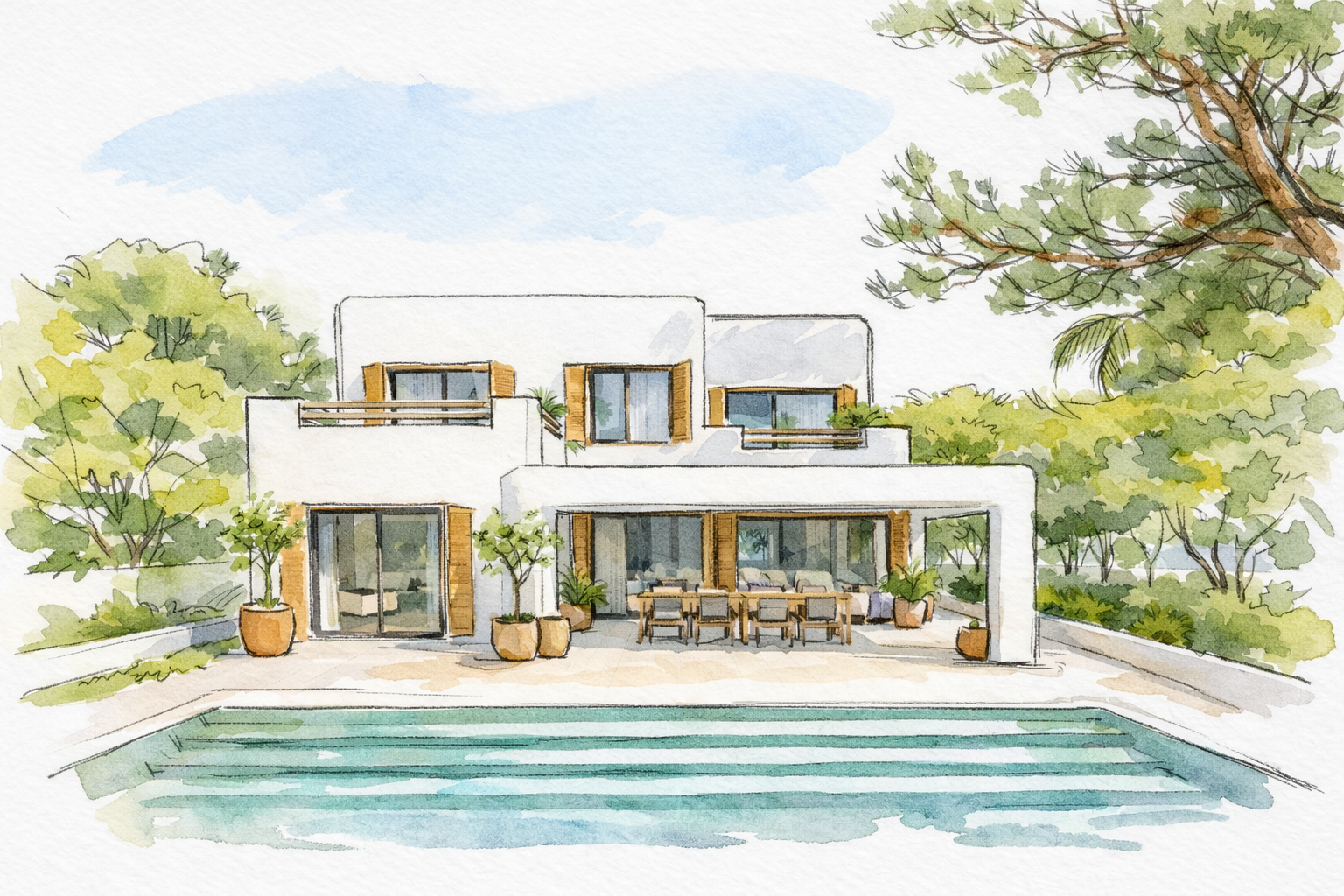 Fusionando arquitectura contemporánea con la calidez mediterránea, las villas cuentan con amplias terrazas, piscinas privadas, acabados en piedra natural y madera y cuidados jardines que crean una atmósfera de serenidad refinada. Los espacios interiores, abiertos y luminosos, se integran de forma fluida con el exterior, donde la brisa marina y las puestas de sol forman parte de la vida cotidiana.